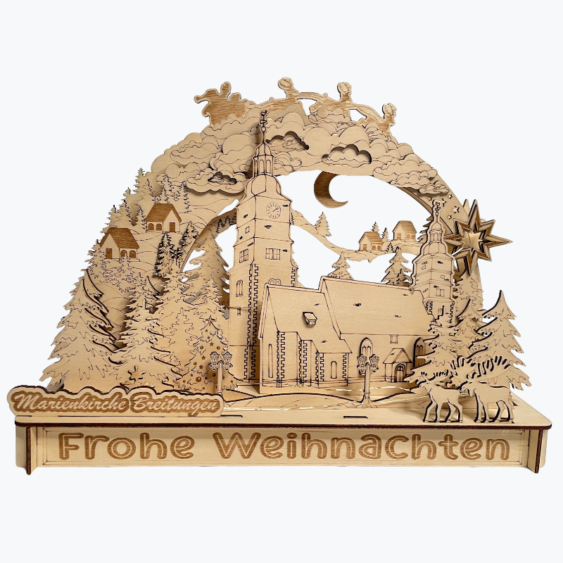 Tauchen Sie ein in die magische Weihnachtszeit mit unserem einzigartigen, handgefertigten Schwibbogen der Marienkirche Breitungen. Dieser liebevoll aus Holz gelaserte Schwibbogen fängt die unverwechselbare Silhouette der Marienkirche ein und besticht durch seine feinen Details, die jedes Zuhause in festlichem Glanz erstrahlen lassen. Die warme LED-Beleuchtung und die kunstvollen Darstellungen von Bäumen, Sternen und der Kirche sorgen für eine besinnliche Atmosphäre, die perfekt zu Jung und Alt passt. Ein echtes Highlight für Ihre Weihnachtsdekoration und eine wunderbare Hommage an die schöne Region Breitungen!